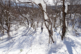 終始ラッセルを計画していましたが、意外にもしっかりした踏み跡ができておりツボ足で問題なくスノートレッキングできています。ルート選定もヒュッテの方向を見失わないようにしながら踏み跡を使わせていただきました。