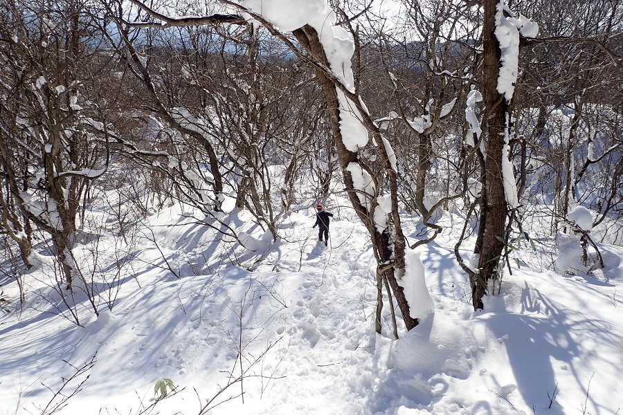 途中、踏み跡を避けてラッセルしました。大人が先頭でラッセルし、踏み跡を10歳児が続くという内容です。大人の後を歩き股下までのラッセルを楽しんでいます。
